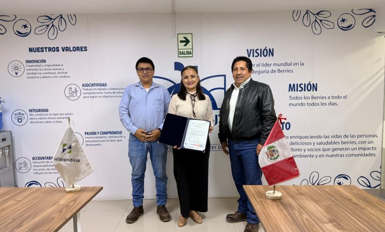 En un acto formal, Hidrandina realizó la entrega oficial de la certificación a su socio estratégico, HORTIFRUT PERÚ S.A.C., en reconocimiento a su compromiso compartido con la sostenibilidad. La ceremonia se llevó a cabo en las instalaciones del cliente y contó con la presencia del Ing. Javier Solis Canorio, Jefe de Unidad de Clientes Mayores de Hidrandina, y de la Sra. Ethel Centurión Sánchez, apoderada legal de Hortifrut.